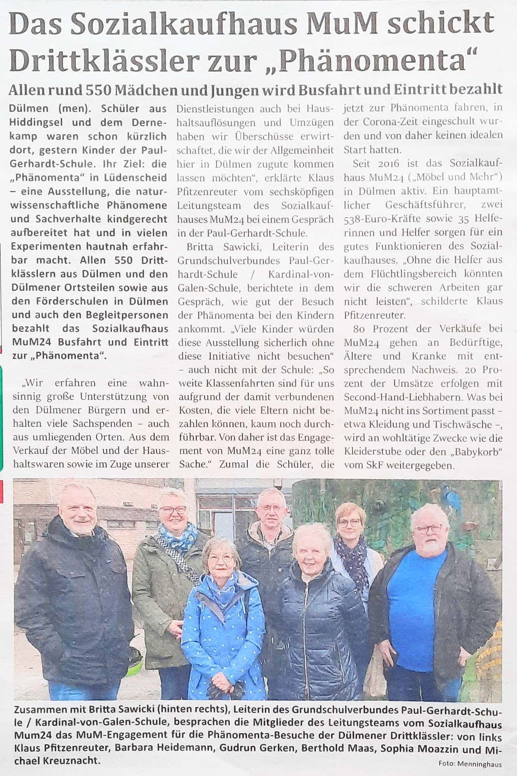 MuM schickt Drittklässler zur "Phänomenta" 16 Mär 2024 Von H.Klausdeinken Bericht der DÜLMENplus vom 16.03.2024 Weiterlesen … MuM schickt Drittklässler zur "Phänomenta"